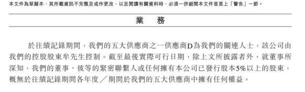 澎湃新闻在招股书中发现,五大供应商之一的供应商D为关连人士,该公司由宜品集团的控制股权的人牟善波控制。