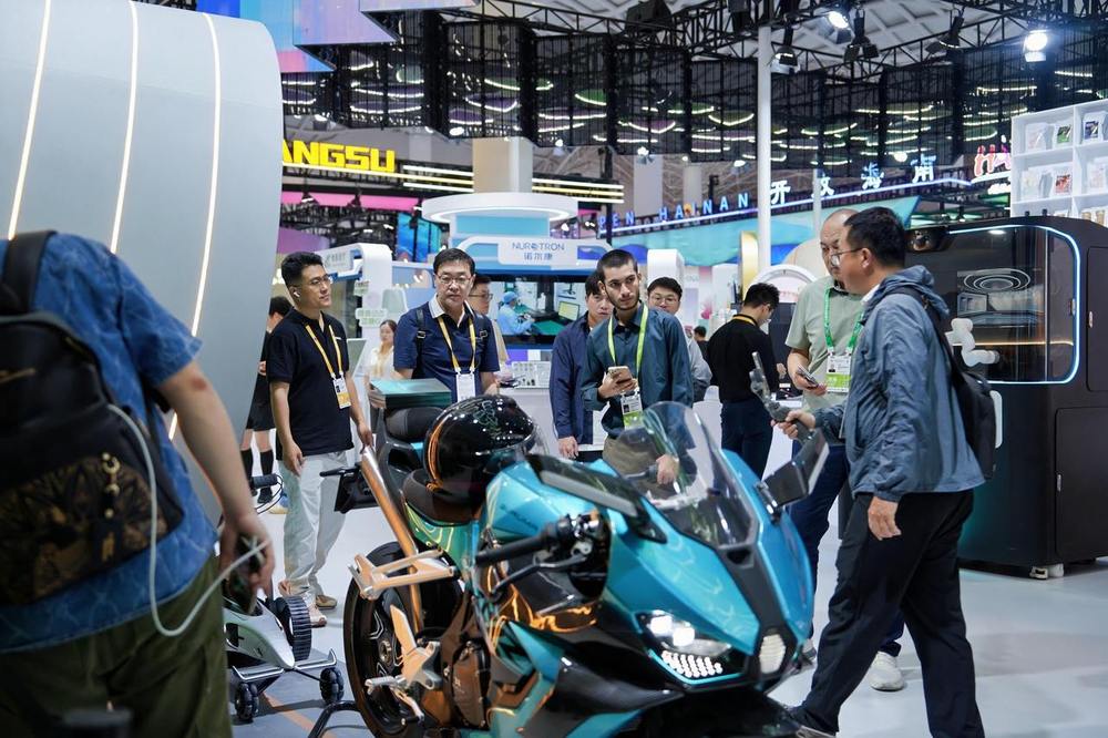 在浙江展区,一辆酷炫的流线RR”摩托车,迎来一波波的围观人群。它来自一家杭州企业,坦途创新人机一体化智能系统(杭州)有限公司旗下的GURUMA风巡科技品牌。